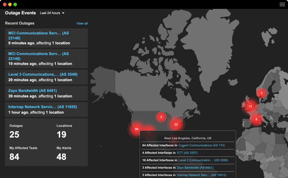 С помощью Internet Insights ThousandEyes показывает не только вашу сеть — а всю картину происходящего в интернете. Где сбоит провайдер? Где упал DNS? Как это влияет на доступность ваших сервисов?